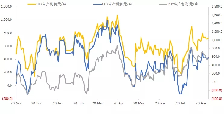 ????????最近聚酯產業鏈下游利潤和開工率齊升,說明終端對聚酯的需求還不錯,上游讓渡的利潤也盤活了下游企業。長絲的產銷最近也有所回升,8月份平均產銷率為83%,基本上與去年同期持平,反觀7月份的平均產銷率只有55%,8月份下游真的是有很大起色,但是上游PTA毫無起色。