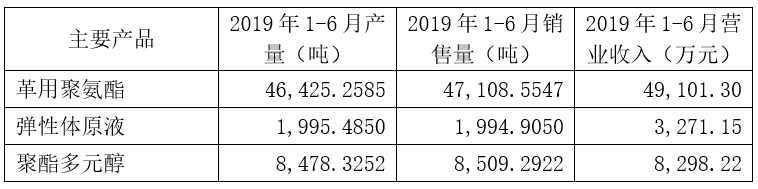 ????????革用聚氨酯2019年1-6月產量46,425.2585噸,2019年1-6月銷售量47,108.5547噸,2019年1-6月營業收入4.91億元。