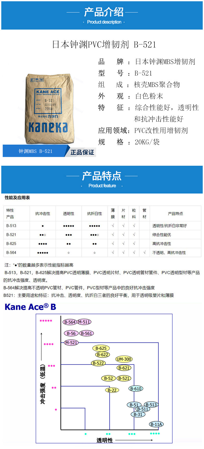 - 日本鐘淵mbs B521 透明抗沖擊綜合性能好 PVC改性增韌劑MBS521 物性表, 日本鐘淵mbs B521 透明抗沖擊綜合性能好 PVC改性增韌劑MBS521 產品參數,日本鐘淵mbs B521 透明抗沖擊綜合性能好 PVC改性增韌劑MBS521 性能表,日本鐘淵mbs B521 透明抗沖擊綜合性能好 PVC改性增韌劑MBS521 出廠報告, MSDS,, 物質安全資料表, UL黃卡,{ SGS報告, RoHS, 食品級認證, NSF飲用水標準, 產品資料, 產品性能, 出廠報告, 原廠原包, 代理商, 熱變形溫度, 熔指數, 流動系數, 抗沖擊性能、沖擊強度, 低溫韌性、低溫抗沖擊性能, 熔體流動系數、熔體流動速率, 加工工藝、加工參數、加工溫度, 歐盟RoHS 德國FDA 美國FDA 日本FDA