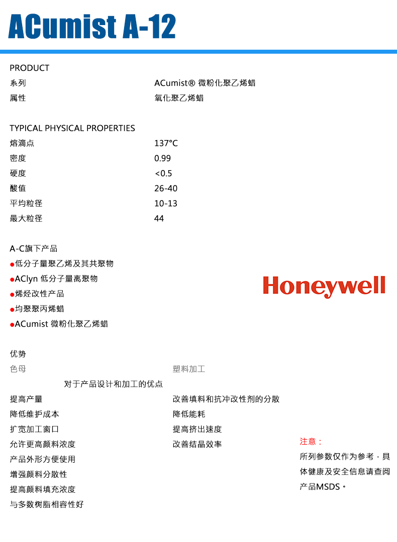 - 霍尼韋爾蠟粉 ACumist A-12 原裝進口 物性表, 霍尼韋爾蠟粉 ACumist A-12 原裝進口 產(chǎn)品參數(shù),霍尼韋爾蠟粉 ACumist A-12 原裝進口 性能表,霍尼韋爾蠟粉 ACumist A-12 原裝進口 出廠報告, MSDS,, 物質(zhì)安全資料表, UL黃卡,{ SGS報告, RoHS, 食品級認(rèn)證, NSF飲用水標(biāo)準(zhǔn), 產(chǎn)品資料, 產(chǎn)品性能, 出廠報告, 原廠原包, 代理商, 熱變形溫度, 熔指數(shù), 流動系數(shù), 抗沖擊性能、沖擊強度, 低溫韌性、低溫抗沖擊性能, 熔體流動系數(shù)、熔體流動速率, 加工工藝、加工參數(shù)、加工溫度, 歐盟RoHS 德國FDA 美國FDA 日本FDA