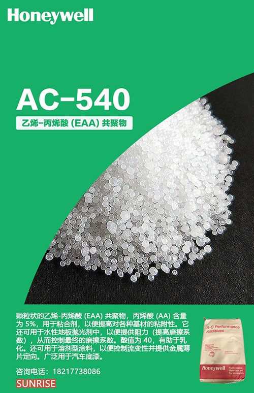 霍尼韋爾A-C 540A為粉末狀的乙烯-丙烯酸 (EAA) 共聚物,丙烯酸 (AA) 含量為 5%,用于粘合劑,以便提高對各種基材的粘附性。霍尼韋爾PE蠟A-C 540A還可用于水性地板拋光劑中,以便提供阻力(提高磨擦系數(shù))。霍尼韋爾PE蠟A-C 540A酸值為40,有助于乳化。還可用于溶劑型涂料,以便控制流變性并提供金屬薄片定向。廣泛用于汽車底漆。霍尼韋爾PE蠟A-C 540A還可用于色母粒和工程樹脂的分散劑。