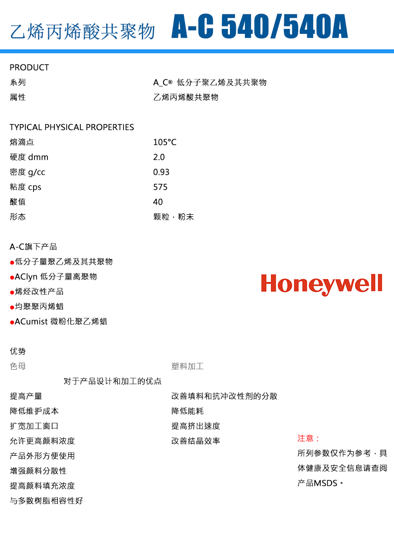 - Honeywell霍尼韋爾 A C 540 蠟粉蠟乳液 物性表, Honeywell霍尼韋爾 A C 540 蠟粉蠟乳液 產(chǎn)品參數(shù),Honeywell霍尼韋爾 A C 540 蠟粉蠟乳液 性能表,Honeywell霍尼韋爾 A C 540 蠟粉蠟乳液 出廠報(bào)告, MSDS,, 物質(zhì)安全資料表, UL黃卡,{ SGS報(bào)告, RoHS, 食品級認(rèn)證, NSF飲用水標(biāo)準(zhǔn), 產(chǎn)品資料, 產(chǎn)品性能, 出廠報(bào)告, 原廠原包, 代理商, 熱變形溫度, 熔指數(shù), 流動系數(shù), 抗沖擊性能、沖擊強(qiáng)度, 低溫韌性、低溫抗沖擊性能, 熔體流動系數(shù)、熔體流動速率, 加工工藝、加工參數(shù)、加工溫度, 歐盟RoHS 德國FDA 美國FDA 日本FDA