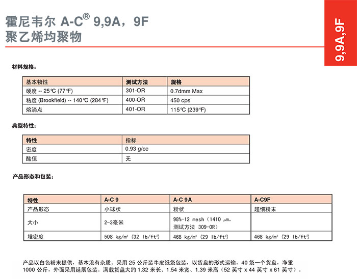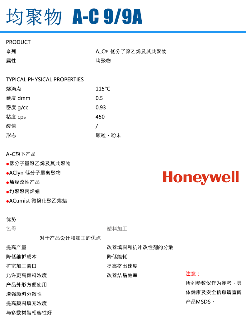 - 霍尼韋爾 A-C® 9A 低密度聚乙烯 (LDPE) 均聚物 物性表, 霍尼韋爾 A-C® 9A 低密度聚乙烯 (LDPE) 均聚物 產品參數(shù),霍尼韋爾 A-C® 9A 低密度聚乙烯 (LDPE) 均聚物 性能表,霍尼韋爾 A-C® 9A 低密度聚乙烯 (LDPE) 均聚物 出廠報告, MSDS,, 物質安全資料表, UL黃卡,{ SGS報告, RoHS, 食品級認證, NSF飲用水標準, 產品資料, 產品性能, 出廠報告, 原廠原包, 代理商, 熱變形溫度, 熔指數(shù), 流動系數(shù), 抗沖擊性能、沖擊強度, 低溫韌性、低溫抗沖擊性能, 熔體流動系數(shù)、熔體流動速率, 加工工藝、加工參數(shù)、加工溫度, 歐盟RoHS 德國FDA 美國FDA 日本FDA