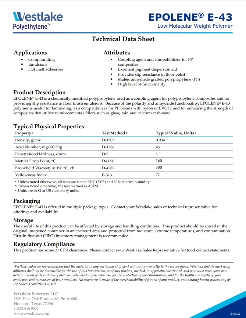 - 西湖化學 E43 Westlake酸酐接枝聚丙烯蠟 EPOLENE E-43 物性表, 西湖化學 E43 Westlake酸酐接枝聚丙烯蠟 EPOLENE E-43 產品參數,西湖化學 E43 Westlake酸酐接枝聚丙烯蠟 EPOLENE E-43 性能表,西湖化學 E43 Westlake酸酐接枝聚丙烯蠟 EPOLENE E-43 出廠報告, MSDS,, 物質安全資料表, UL黃卡,{ SGS報告, RoHS, 食品級認證, NSF飲用水標準, 產品資料, 產品性能, 出廠報告, 原廠原包, 代理商, 熱變形溫度, 熔指數, 流動系數, 抗沖擊性能、沖擊強度, 低溫韌性、低溫抗沖擊性能, 熔體流動系數、熔體流動速率, 加工工藝、加工參數、加工溫度, 歐盟RoHS 德國FDA 美國FDA 日本FDA
