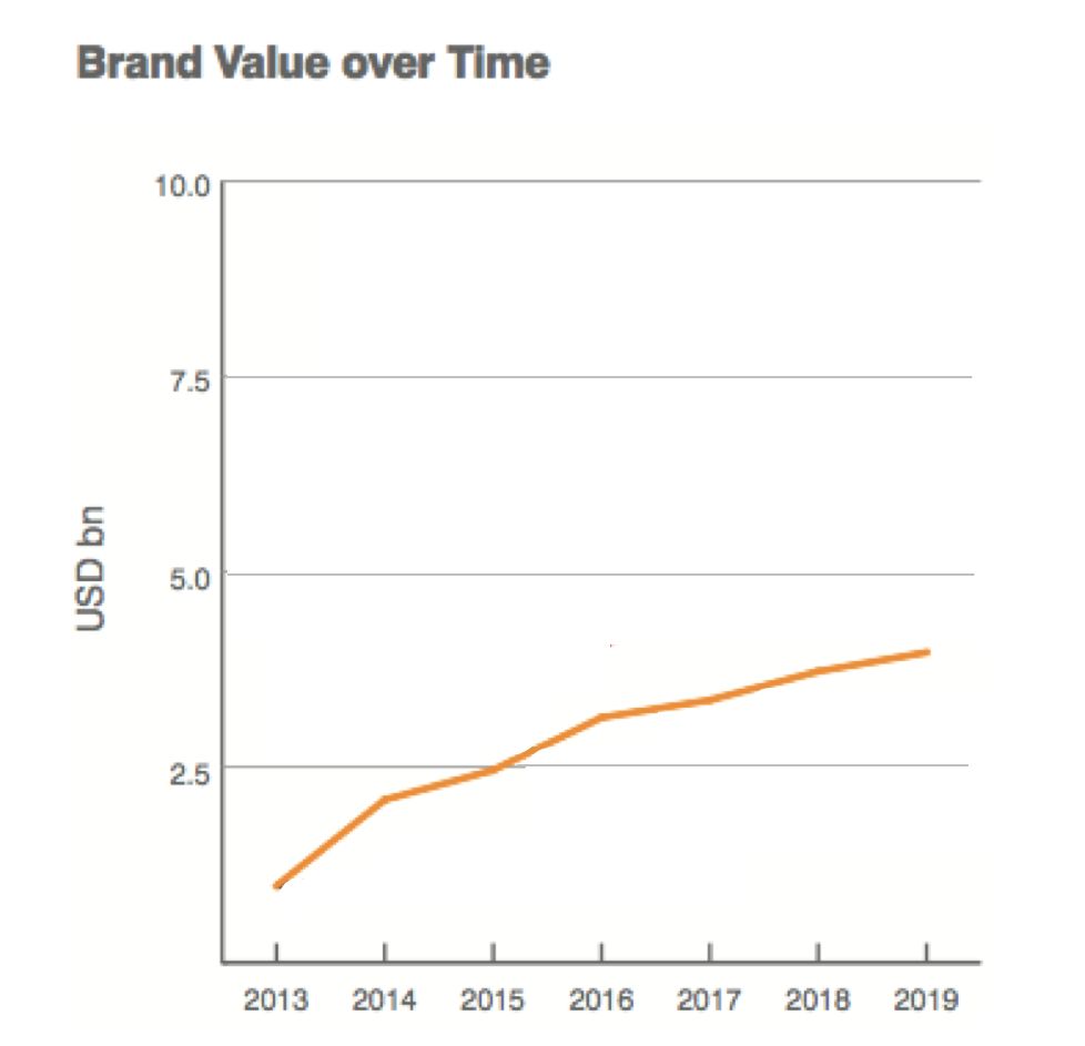 Brand Finance 品牌估值方法采用“特許費節(jié)省法”(Royalty Relief):即在假設品牌所用者不再擁有該品牌的前提下,品牌所有者必須支付的使用該品牌的費用。排行榜中的品牌價值數字是品牌作為資產轉讓的潛在價值。一家公司可能擁有多個品牌,企業(yè)價值是其所有各品牌相關資產和收入流價值的總和。