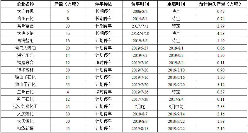????????據統計,2019年7月份國內聚丙烯檢修損失量在20.12萬噸,環比(2019年6月份22.01萬噸)減少1.89萬噸,降幅在8.58%;同比(2018年7月16.96萬噸)增加3.16萬噸,增幅18.63%。2019年1-7月份,累積檢修損失量為134.52萬噸,較去年同期小幅增加,增幅僅在0.85%。