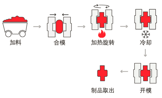 主要用于熱固性塑料制品的生產(chǎn)。成型經(jīng)過加熱使其熔化,加壓沖模,再經(jīng)過加熱交聯(lián)固化,脫模后既得制品。