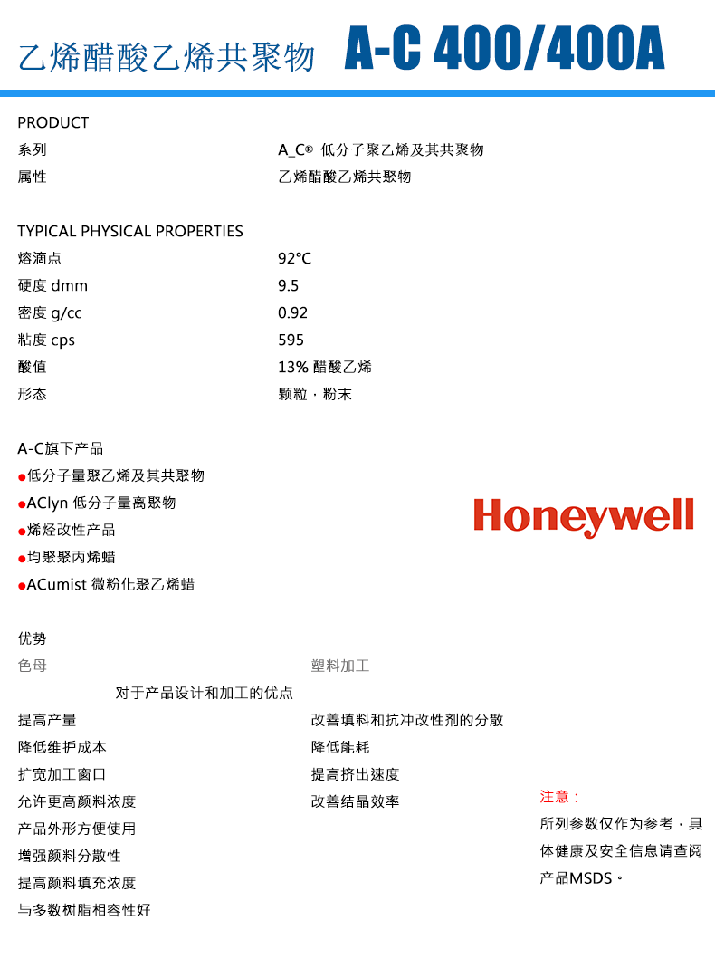 - 霍尼韋爾 honeywell EVA蠟 乙烯-醋酸乙烯共聚物蠟 AC-400A 顏料分散劑 物性表, 霍尼韋爾 honeywell EVA蠟 乙烯-醋酸乙烯共聚物蠟 AC-400A 顏料分散劑 產品參數,霍尼韋爾 honeywell EVA蠟 乙烯-醋酸乙烯共聚物蠟 AC-400A 顏料分散劑 性能表,霍尼韋爾 honeywell EVA蠟 乙烯-醋酸乙烯共聚物蠟 AC-400A 顏料分散劑 出廠報告, MSDS,, 物質安全資料表, UL黃卡,{ SGS報告, RoHS, 食品級認證, NSF飲用水標準, 產品資料, 產品性能, 出廠報告, 原廠原包, 代理商, 熱變形溫度, 熔指數, 流動系數, 抗沖擊性能、沖擊強度, 低溫韌性、低溫抗沖擊性能, 熔體流動系數、熔體流動速率, 加工工藝、加工參數、加工溫度, 歐盟RoHS 德國FDA 美國FDA 日本FDA