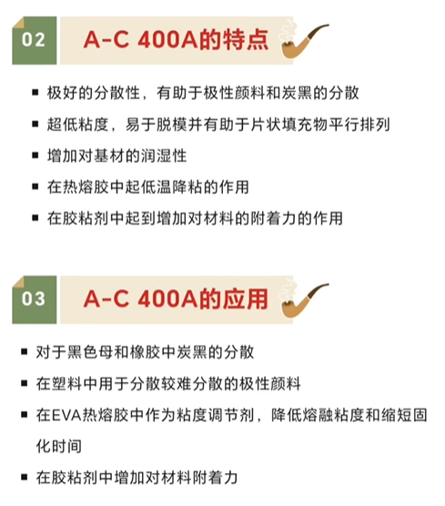 A-C 400A在EVA熱熔膠行業中,有廣泛應用,是的粘度調節劑。在配方中加入可以降低熔融粘度縮短固化時間,減少抽絲現象;可進一步改善熱熔膠的流動性和潤溫性;可防止熱熔膠存放結塊及表面發粘,但用量過多會使膠接強度下降,一般地加入量不超過30%。