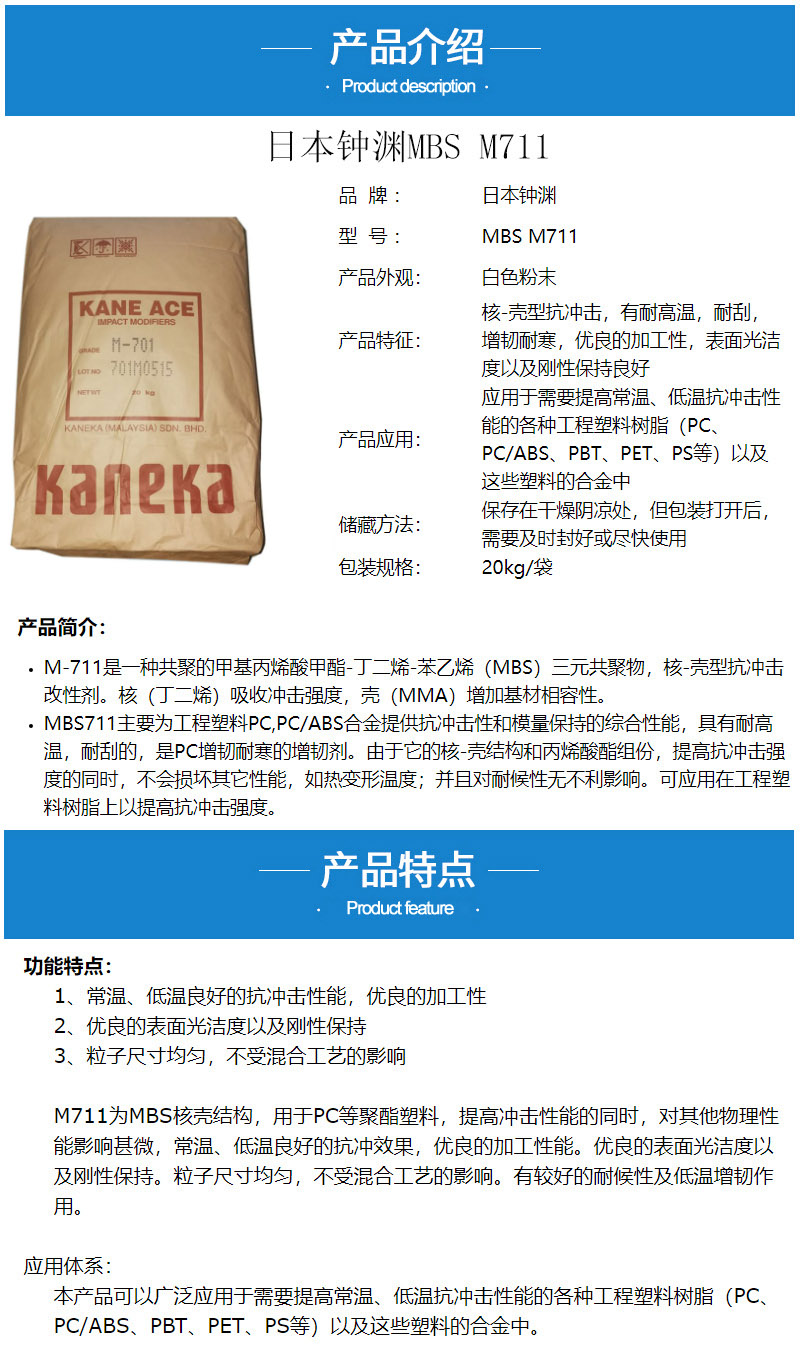 - MBS日本鐘淵M711 耐寒耐候增韌劑 PC抗沖擊改性劑 鐘淵mbs711 物性表, MBS日本鐘淵M711 耐寒耐候增韌劑 PC抗沖擊改性劑 鐘淵mbs711 產品參數,MBS日本鐘淵M711 耐寒耐候增韌劑 PC抗沖擊改性劑 鐘淵mbs711 性能表,MBS日本鐘淵M711 耐寒耐候增韌劑 PC抗沖擊改性劑 鐘淵mbs711 出廠報告, MSDS,, 物質安全資料表, UL黃卡,{ SGS報告, RoHS, 食品級認證, NSF飲用水標準, 產品資料, 產品性能, 出廠報告, 原廠原包, 代理商, 熱變形溫度, 熔指數, 流動系數, 抗沖擊性能、沖擊強度, 低溫韌性、低溫抗沖擊性能, 熔體流動系數、熔體流動速率, 加工工藝、加工參數、加工溫度, 歐盟RoHS 德國FDA 美國FDA 日本FDA