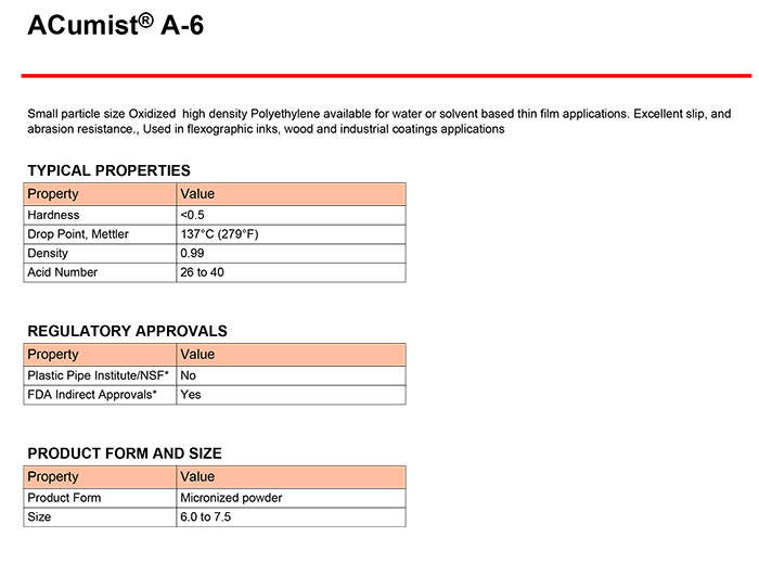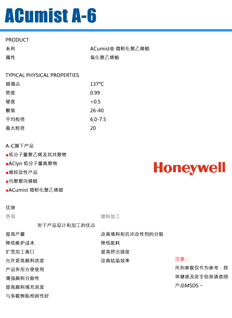 - 霍尼韋爾蠟粉 ACumist A-6 微粉化氧化聚乙烯蠟 物性表, 霍尼韋爾蠟粉 ACumist A-6 微粉化氧化聚乙烯蠟 產品參數,霍尼韋爾蠟粉 ACumist A-6 微粉化氧化聚乙烯蠟 性能表,霍尼韋爾蠟粉 ACumist A-6 微粉化氧化聚乙烯蠟 出廠報告, MSDS,, 物質安全資料表, UL黃卡,{ SGS報告, RoHS, 食品級認證, NSF飲用水標準, 產品資料, 產品性能, 出廠報告, 原廠原包, 代理商, 熱變形溫度, 熔指數, 流動系數, 抗沖擊性能、沖擊強度, 低溫韌性、低溫抗沖擊性能, 熔體流動系數、熔體流動速率, 加工工藝、加工參數、加工溫度, 歐盟RoHS 德國FDA 美國FDA 日本FDA