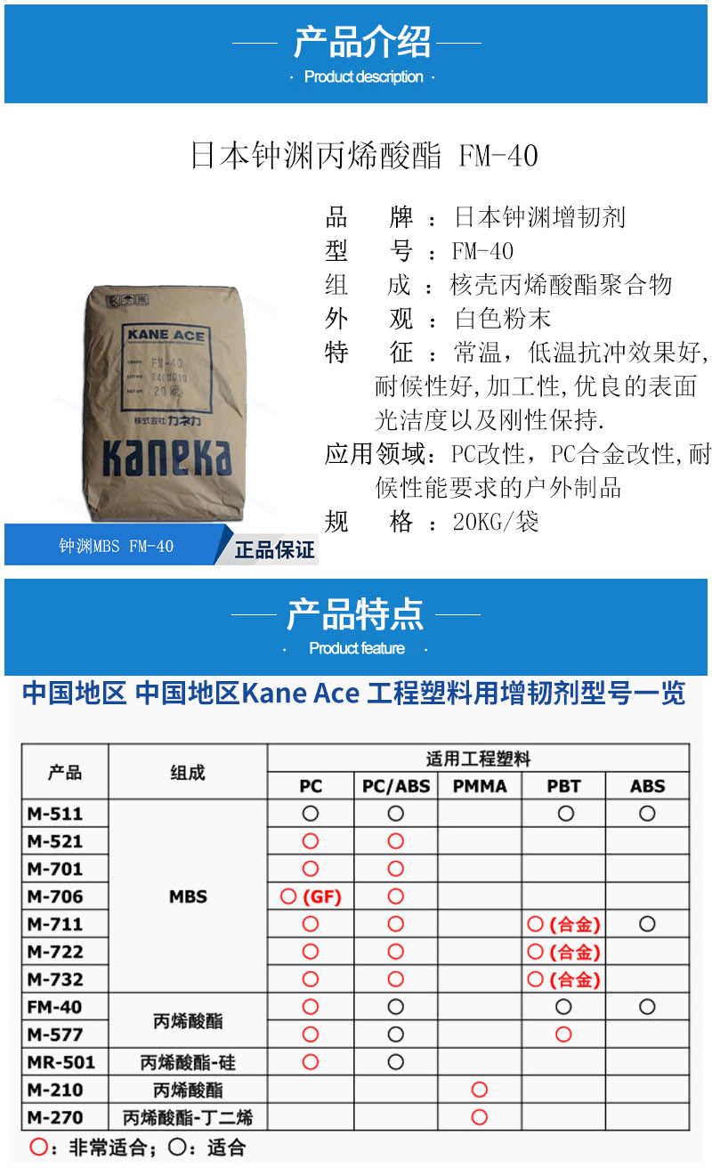- 日本鐘淵FM40 PC低溫常溫改性PBT抗沖擊劑 丙烯酸酯類增韌劑FM-40 物性表, 日本鐘淵FM40 PC低溫常溫改性PBT抗沖擊劑 丙烯酸酯類增韌劑FM-40 產品參數,日本鐘淵FM40 PC低溫常溫改性PBT抗沖擊劑 丙烯酸酯類增韌劑FM-40 性能表,日本鐘淵FM40 PC低溫常溫改性PBT抗沖擊劑 丙烯酸酯類增韌劑FM-40 出廠報告, MSDS,, 物質安全資料表, UL黃卡,{ SGS報告, RoHS, 食品級認證, NSF飲用水標準, 產品資料, 產品性能, 出廠報告, 原廠原包, 代理商, 熱變形溫度, 熔指數, 流動系數, 抗沖擊性能、沖擊強度, 低溫韌性、低溫抗沖擊性能, 熔體流動系數、熔體流動速率, 加工工藝、加工參數、加工溫度, 歐盟RoHS 德國FDA 美國FDA 日本FDA