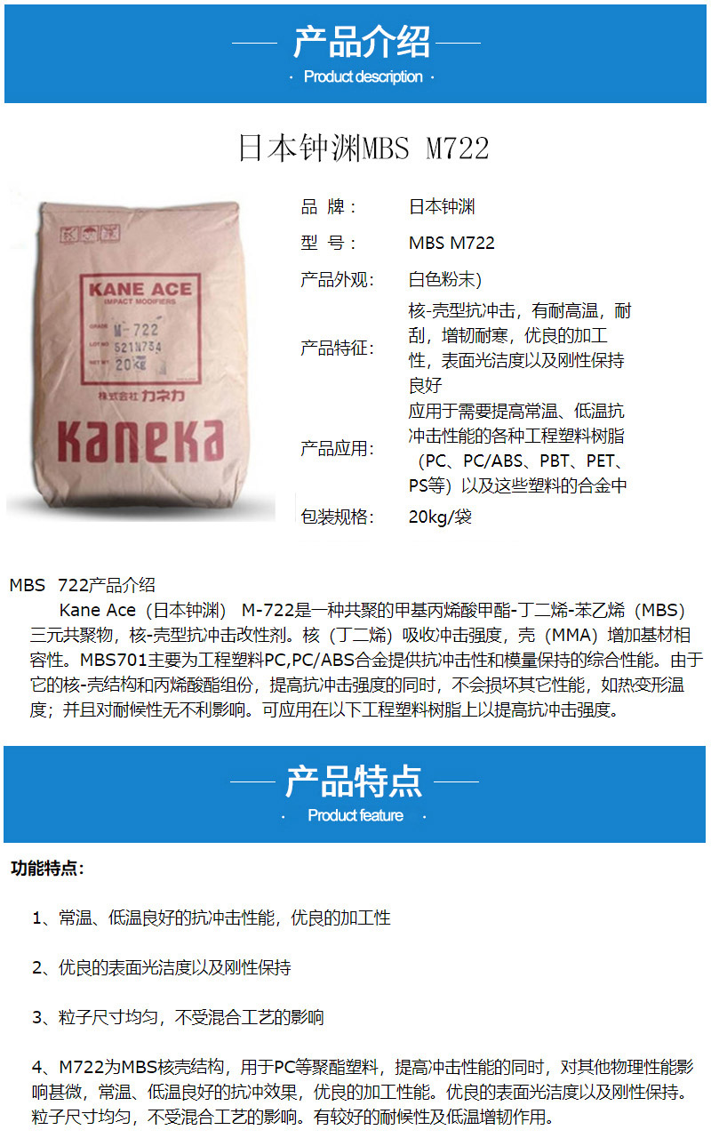 - MBS 722 PC增韌劑日本鐘淵 M-722粉末 PC/ABS抗沖擊改性劑 mbs722 物性表, MBS 722 PC增韌劑日本鐘淵 M-722粉末 PC/ABS抗沖擊改性劑 mbs722 產品參數,MBS 722 PC增韌劑日本鐘淵 M-722粉末 PC/ABS抗沖擊改性劑 mbs722 性能表,MBS 722 PC增韌劑日本鐘淵 M-722粉末 PC/ABS抗沖擊改性劑 mbs722 出廠報告, MSDS,, 物質安全資料表, UL黃卡,{ SGS報告, RoHS, 食品級認證, NSF飲用水標準, 產品資料, 產品性能, 出廠報告, 原廠原包, 代理商, 熱變形溫度, 熔指數, 流動系數, 抗沖擊性能、沖擊強度, 低溫韌性、低溫抗沖擊性能, 熔體流動系數、熔體流動速率, 加工工藝、加工參數、加工溫度, 歐盟RoHS 德國FDA 美國FDA 日本FDA