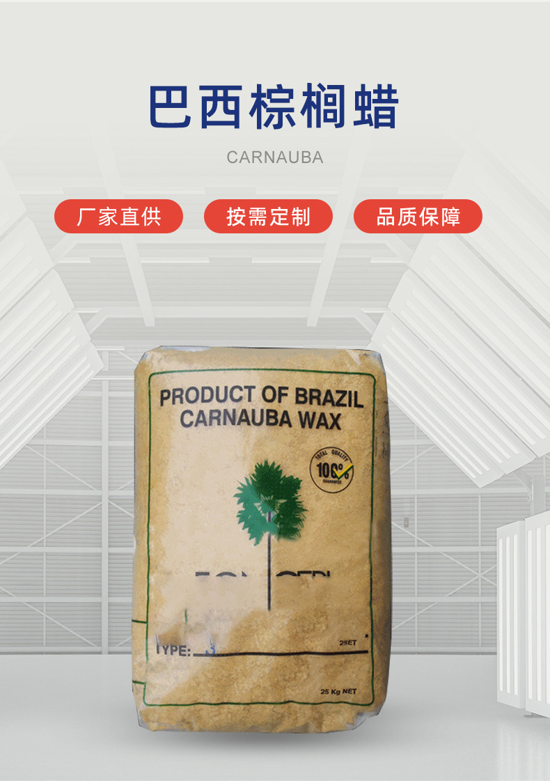巴西棕櫚蠟質(zhì)地非常堅硬,具有極高的光澤,極易乳化,有著良好的保油性,它最大的優(yōu)點是具有其它蠟所沒有的光澤度和硬度。此外,它具有的拋光特性使其成為皮革等行業(yè)上不可或缺的原料。可應(yīng)用于制造復(fù)寫紙。棕櫚蠟稀薄而黏滯度小,樹脂含量低,涂布均勻,流動性能好,制成的復(fù)寫紙性能好。也巴西棕櫚蠟可用于地板蠟和鞋油,具有光澤好、光潔度高、表面沒有油膩的優(yōu)點。還可用于橡膠防老劑,同時具有一定的軟化與潤滑作用,使膠料易脫模和壓出,使成品外觀平整。