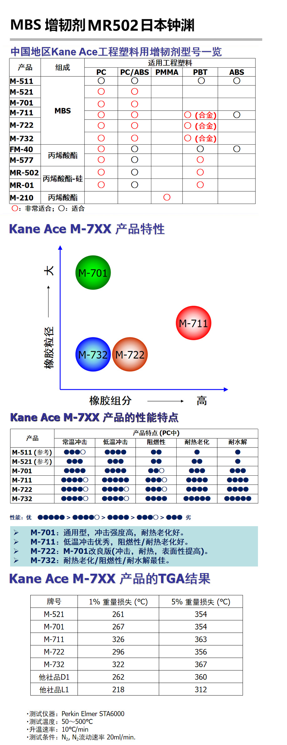 - 增韌劑MR502(日本鐘淵) PC/PBT等材料應用 物性表, 增韌劑MR502(日本鐘淵) PC/PBT等材料應用 產品參數,增韌劑MR502(日本鐘淵) PC/PBT等材料應用 性能表,增韌劑MR502(日本鐘淵) PC/PBT等材料應用 出廠報告, MSDS,, 物質安全資料表, UL黃卡,{ SGS報告, RoHS, 食品級認證, NSF飲用水標準, 產品資料, 產品性能, 出廠報告, 原廠原包, 代理商, 熱變形溫度, 熔指數, 流動系數, 抗沖擊性能、沖擊強度, 低溫韌性、低溫抗沖擊性能, 熔體流動系數、熔體流動速率, 加工工藝、加工參數、加工溫度, 歐盟RoHS 德國FDA 美國FDA 日本FDA